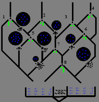 Die 6 Liter ganz links werden in 4 und 2 Liter aufgeteilt. 4 Fließen zu Verteiler 6, 2 daran vorbei. Letztere verenden in einem Schließmechanismus.
